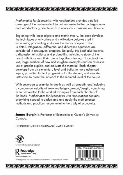 Mathematics for Economists with Applications provides detailed coverage of the mathematical techniques essential for undergraduate and introductory graduate work in economics, business and finance. Beginning with linear algebra and matrix theory, the book develops the techniques of univariate and multivariate calculus used in economics, proceeding to discuss the theory of optimization in detail. Integration, differential and difference equations are considered in subsequent chapters. Uniquely, the book also features a discussion of statistics and probability, including a study of the key distributions and their role in hypothesis testing. Throughout the text, large numbers of new and insightful examples and an extensive use of graphs explain and motivate the material. Each chapter develops from an elementary level and builds to more advanced topics, providing logical progression for the student, and enabling instructors to prescribe material to the required level of the course. With coverage substantial in depth as well as breadth, and including a companion website at www.routledge.com/cw/bergin, containing exercises related to the worked examples from each chapter of the book, Mathematics for Economists with Applications contains everything needed to understand and apply the mathematical methods and practices fundamental to the study of economics.