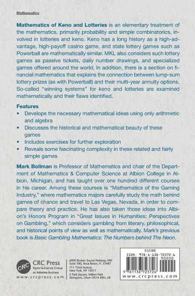 Chapter 1. Historical Background. 1.1 History of. 1.2 History of Lotteries. Chapter 2. Mathematical Foundations. 2.1 Elementary Probability. 2.2 Addition Rules. 2.3 Conditional Probability. 2.4 Random Variables and Expected Value. 2.5 Combinatorics. 2.6 Binomial Distribution. Chapter 3. Keno. 3.1 Standard Keno Wagers. 3.2 Game Variations. 3.3 The Big Picture. 3.4 Video Keno. 3.5 Keno Side Bets. 3.6 Keno Strategies: Do They Work?. Chapter 4. Lotteries. 4.2 Passive Lottery Tickets. 4.3 Lotto Games. 4.4 Games Where Order Matters. 4.5 Powerball. 4.6 Lotto Strategies: Do They Work?