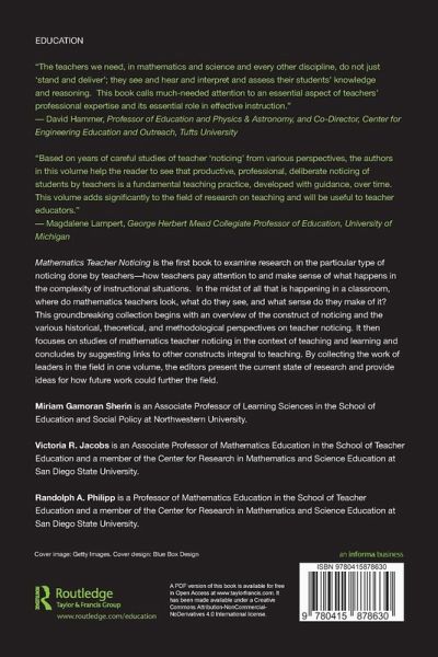 This is the first book to examine research on mathematics teacher noticing---how teachers pay attention to and make sense of what happens in the complexity of instructional situations.