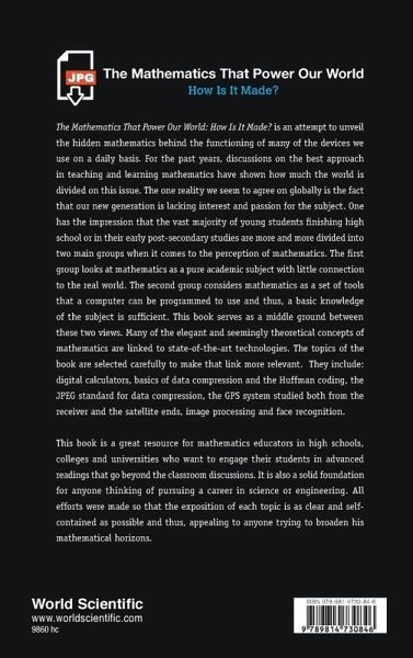 The Mathematics That Power Our World: How Is It Made? is an attempt to unveil the hidden mathematics behind the functioning of many of the devices we use on a daily basis. For the past years, discussions on the best approach in teaching and learning mathematics have shown how much the world is divided on this issue. The one reality we seem to agree on globally is the fact that our new generation is lacking interest and passion for the subject. One has the impression that the vast majority of young students finishing high school or in their early post-secondary studies are more and more divided into two main groups when it comes to the perception of mathematics. The first group looks at mathematics as a pure academic subject with little connection to the real world. The second group considers mathematics as a set of tools that a computer can be programmed to use and thus, a basic knowledge of the subject is sufficient. This book serves as a middle ground between these two views. Many of the elegant and seemingly theoretical concepts of mathematics are linked to state-of-the-art technologies. The topics of the book are selected carefully to make that link more relevant. They include: digital calculators, basics of data compression and the Huffman coding, the JPEG standard for data compression, the GPS system studied both from the receiver and the satellite ends, image processing and face recognition. This book is a great resource for mathematics educators in high schools, colleges and universities who want to engage their students in advanced readings that go beyond the classroom discussions. It is also a solid foundation for anyone thinking of pursuing a career in science or engineering. All efforts were made so that the exposition of each topic is as clear and self-contained as possible and thus, appealing to anyone trying to broaden his mathematical horizons.
