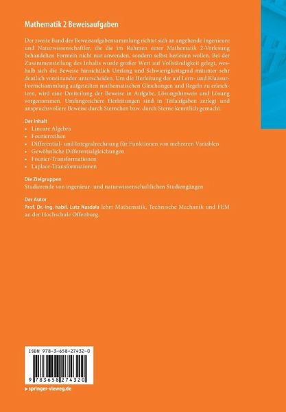 Der zweite Band der Beweisaufgabensammlung richtet sich an angehende Ingenieure und Naturwissenschaftler, die die im Rahmen einer Mathematik 2-Vorlesung behandelten Formeln nicht nur anwenden, sondern selbst herleiten wollen. Bei der Zusammenstellung des Inhalts wurde großer Wert auf Vollständigkeit gelegt, weshalb sich die Beweise hinsichtlich Umfang und Schwierigkeitsgrad mitunter sehr deutlich voneinander unterscheiden. Um die Herleitung der auf Lern- und Klausur-Formelsammlung aufgeteilten mathematischen Gleichungen und Regeln zu erleichtern, wird eine Dreiteilung der Beweise in Aufgabe, Lösungshinweis und Lösung vorgenommen. Umfangreichere Herleitungen sind in Teilaufgaben zerlegt und anspruchsvollere Beweise durch Sternchen bzw. durch Sterne kenntlich gemacht.