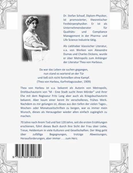 Thea von Harbou ist u.a. bekannt als Autorin von Metropolis, Drehbuchautorin von "M - Eine Stadt sucht ihren Mörder" und ihrer Ehe mit dem Regisseur Fritz Lang aber auch als Kriegsbuchautorin bekannt. Aber kaum einer kennt ihr verschollenes, frühes Werk. Nachdem es mir gelungen ist, dieses aus den tiefen der vielen Tages-, Wochen- oder Monatszeitschriften zu bergen, war es immer mein Wunsch, dieses als Herausgeber wieder allen einfach zugänglich zu machen. 70 Jahre nach ihrem Tod und fast 120 Jahre, seit die ersten Erzählungen erschienen, führt dieses Buch durch ihre Sicht der Frau über Liebe, Treue, Heldentum in viele Kulturen und Gesellschaften. Der Weg geht über zufällige Begegnungen, trotzige Abweisungen, Herausforderungen, aber immer . . . zum Herz.