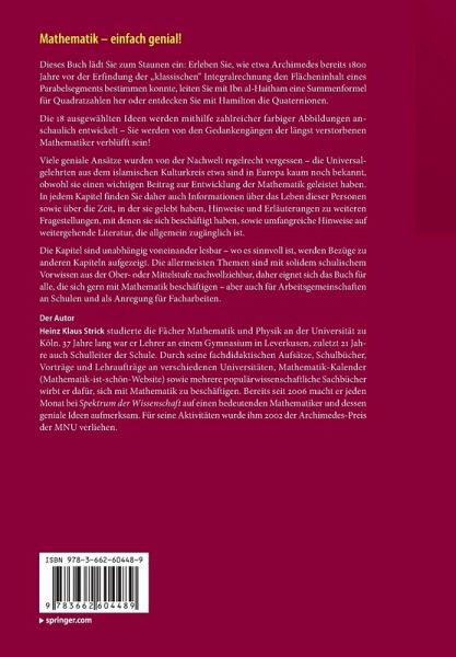 Die 18 ausgewählten Ideen werden mithilfe zahlreicher farbiger Abbildungen anschaulich entwickelt - Sie werden von den Gedankengängen der längst verstorbenen Mathematiker verblüfft sein!