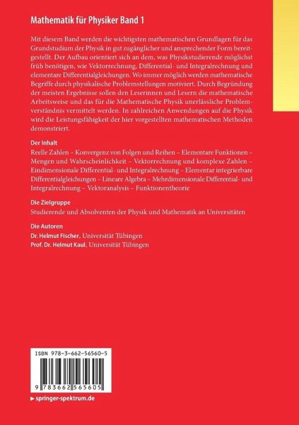 Mit diesem Band werden die wichtigsten mathematischen Grundlagen für das Grundstudium der Physik in gut zugänglicher und ansprechender Form bereitgestellt. Der Aufbau orientiert sich an dem, was Physikstudierende möglichst früh benötigen, wie Vektorrechnung, Differential- und Integralrechnung und elementare Differentialgleichungen. Wo immer möglich, werden mathematische Begriffe durch physikalische Problemstellungen motiviert. Durch Begründung der meisten Ergebnisse sollen den Lesern und Leserinnen die mathematische Arbeitsweise und das für die mathematische Physik unerlässliche Problemverständnis vermittelt werden. In zahlreichen Anwendungen auf die Physik wird die Leistungsfähigkeit der hier vorgestellten mathematischen Methoden demonstriert.
