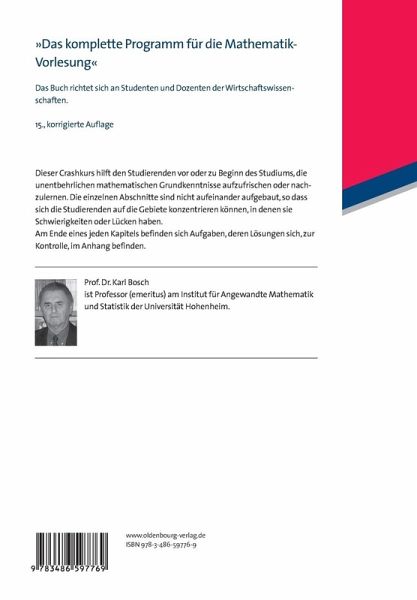 Dieser Crashkurs hilft den Studierenden vor oder zu Beginn des Studiums, die unentbehrlichen mathematischen Grundkenntnisse aufzufrischen oder nachzulernen. Die einzelnen Abschnitte sind nicht aufeinander aufgebaut, so dass sich der Studierende auf die Gebiete konzentrieren kann, in denen er Schwierigkeiten oder Lücken hat. Am Ende eines jeden Kapitels befinden sich Aufgaben, deren Lösungen sich, zur Kontrolle, im Anhang befinden.