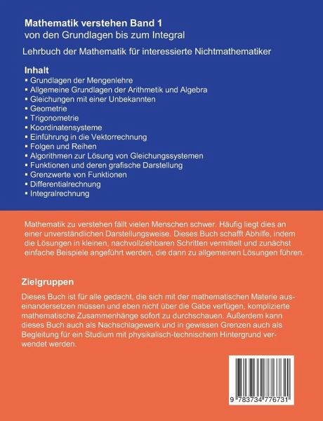 Dieses Buch kann für jeden Schüler einer weiterführenden Schule als begleitende Lektüre verwendet werden. Aber es ist auch für Lehrer geeignet, die sich mit meiner Darstellung des mathematischen Stoffes anfreunden können. Weiterhin ist dieses Buch für alle gedacht, die sich mit der mathematischen Materie auseinandersetzen müssen und eben nicht über die Gabe verfügen, komplizierte mathematische Zusammenhänge sofort zu durchschauen. Außerdem kann dieses Buch auch als Nachschlagewerk und in gewissen Grenzen auch als Begleitung für ein Studium mit physikalisch-technischem Hintergrund verwendet werden. Lösung von mathematischen Problemstellungen in kleinen, nachvollziehbaren Schritten, so dass dem Leser ein hohes Maß an Verständnis für die jeweilige Problemstellung vermittelt werden kann. Zunächst werden jeweils sehr einfache Beispiele für die Aufgabe angeführt, die dann nach und nach zu einer allgemeinen Lösung aufgebaut werden. Diese wird dann abgeleitet und durch weitere Beispiele untermauert.