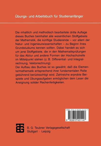Das vorliegende Übungs- und Arbeitsbuch dient der Vorbereitung auf die Mathe matik-Grundausbildung an Hochschulen im weitesten Sinne. Dabei stehen natur-, ingenieur-und wirtschafts wissenschaftliche Studiengänge im Mittelpunkt. Es wendet sich sowohl an jene Leser, die sich frühzeitig entschlossen haben, ein mathematikintensives Studium zu beginnen, als auch an alle, die schon studieren und nun merken, was ihnen an Mathematikkenntnissen fehlt, und die das Fehlende mög lichst schnell nachholen wollen. Das Buch beinhaltet alle wesentlichen Stoffgebiete, die auch in den Mathematikprü fungen zum Abitur und zu anderen Formen der Hochschulreife von Bedeutung sind. Da es in Deutschland kein "Einheitsabitur" gibt, sind die Kenntnisse, Fähigkeiten und Fertigkeiten im Fach Mathematik -sogar bei Studienanfängern formal gleicher Bil dungswege -extrem unterschiedlich und nicht selten zu gering. Die Mathematikaus bildung an Hochschulen orientiert sich dann meist an einem "mittleren" Studenten. Die Folge sind außerordentliche Schwierigkeiten bei einem beträchtlichen Teil der Studienanfänger, und das nicht nur im Fach Mathematik, sondern auch in anderen Grundlagenfächern. Oft ist das Scheitern eines Hochschulstudiums auf diese Anfangsschwierigkeiten zu rückzuführen, während gute Mathematik-Vorkenntnisse für den Erfolg des Studiums und sogar für den beruflichen Erfolg entscheidend sein können. Die Autoren kennen diese Probleme von beiden Seiten: aus der Sicht der Mathematik Grundausbildung an Hochschulen und aus der Sicht der Vorbereitung auf das Hoch schulstudium.Dabei haben sie auch jahrelang mit verschiedenen von ihnen entwickel ten Lehrmaterialien Erfahrungen sammeln können.