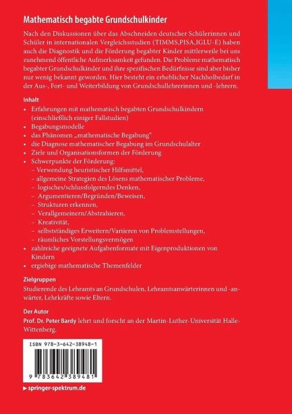 Das Buch von Peter Bardy legt solide die theoretischen Grundlagen zu Hochbegabung dar, auf welchen es nachher einen Fachbereich konkretisiert und mit reichen Beispielen versieht. Es ist ein sehr willkommenes, kompaktes und praxisorientiertes Grundlagenbuch für die Ausbildung von Lehrkräften im Bereich Mathematikdidaktik. Esther Brunner, Pädagogische Hochschule Thurgau, Kreuzlingen
