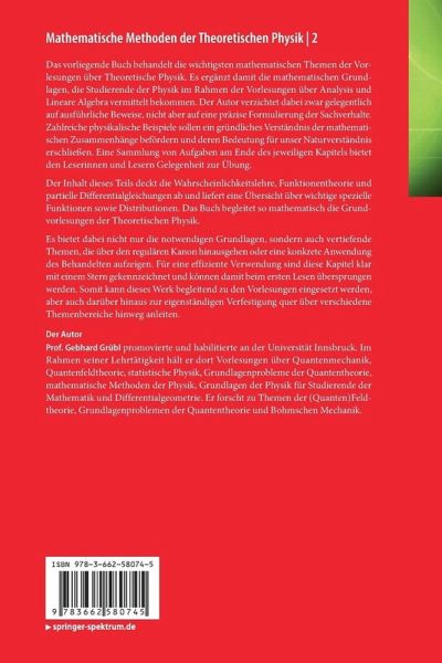 Das vorliegende Buch behandelt die wichtigsten mathematischen Themen der Vorlesungen über Theoretische Physik. Es ergänzt damit die mathematischen Grundlagen, die Studierende der Physik im Rahmen der Vorlesungen über Analysis und Linearen Algebra vermittelt bekommen. Der Autor verzichtet dabei zwar gelegentlich auf ausführliche Beweise, nicht aber auf eine präzise Formulierung der Sachverhalte. Zahlreiche physikalische Beispiele sollen ein gründliches Verständnis der mathematischen Zusammenhänge befördern und deren Bedeutung für unser Naturverständnis erschließen. Eine Sammlung von Aufgaben am Ende des jeweiligen Kapitels bietet den Leserinnen und Lesern Gelegenheit zur Übung.Der Inhalt dieses Teils deckt die Wahrscheinlichkeitslehre, Funktionentheorie und partielle Differentialgleichungen ab und liefert eine Übersicht über wichtige spezielle Funktionen sowie Distributionen. Das Buch begleitet so mathematisch die Grundvorlesungen der Theoretischen Physik.
