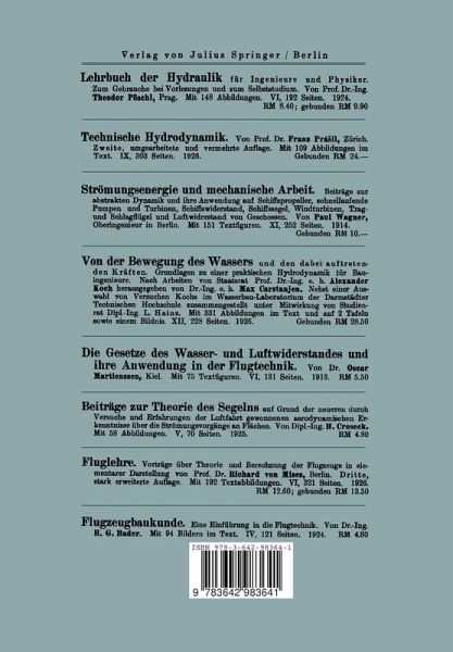 I. Grundgesetze der Strömungslehre.- 1. Der Bewegungs- und Spannungszustand der Ldeformierbaren Materie.- 2. Die Grundgleichungen für die inkompressible Flüssigkeit.- 3. Wirbel- und Potentialfelder.- 4. Gesetze der Potentialströmung.- 5. Aufbau eines Strömungsfeldes aus Quellen und Wirbeln.- 6. Die allgemeinen Impulssätze.- 7. Ähnlichkeitsgesetze.- II. Umformungen und funktionentheoretische Hilfsmittel.- 8. Umformung auf besondere Koordinatensysteme.- 9. Hydrodynamischer Charakter der Lösungen der Gleichung ?2?=0.- 10. Die ebene Potentialströmung.- 11. Die abbildenden Funktionen in der Ebene.- 12. Umformungen der Impulsformeln.- 13. Die Lagallyschen Formeln für die ebenen Strömungen mit diskreten Singularitäten.- III. Strömungen um feste Körper.- 14. Einfache Fälle achsensymmetrischer Strömung.- 15. Zusammengesetzte Fälle.- 16. Physikalische Vorgänge. Resultate der Messung.- 17. Querströmung um Rotationskörper.- 18. Ebene Strömung um zylindrische Körper.- 19. Zylinder im begrenzten Strom und Meßresultate.- 20. Erweiterung durch konforme Abbildung.- 21. Berechnung der Kräfte und Vergleich mit der Messung.- IV. Stromfelder mit freien und gebundenen Wirbeln.- 22. Systeme paralleler Stabwirbel.- 23. Wirbelschichten.- V. Einfluß von Zirkulationen und Wirbeln auf den Strömungsdruck an zylindrischen Körpern.- 24. Die Kräfte am bewegten Kreiszylinder.- 25. Die Kräfte am rotierenden Zylinder (Magnus-Effekt).- 26. Die Strömung um zwei rotierende Walzen.- 27. Strömung um einen rotierenden Zylinder mit freien Wirbeln.- VI. Methode des unstetigen Potentials.- 28. Der klassische Ansatz.- 29. Erweiterung des Rayleighschen Ansatzes für die Platte.- 30. Unstetiges Potential für die Strömung um den Kreiszylinder.- 31. Die Methode von Levi-Civita.-VII. Theorie des Tragflügels.- 32. Geometrie des Flügelprofils.- 33. Die Profilströmung mit Zirkulation.- 34. Zirkulation und Wirbelschicht.- 35. Das Wirbelsystem am begrenzten Flügel.- 36. Die Kräfte am begrenzten Flügel.- 37. Lösung durch ein unstetiges Potential.- 38. Ergänzung zur Widerstandsberechnung.- 39. Zum Problem der instationären Tragflügelströmung.- VIII. Aus der Theorie des Propellers.- 40. Die achsensymmetrische Idealströmung in der Umgebung der Schraube.- 41. Zirkulations- und Wirbelfadentheorie des Propellers.- 42. Propeller mit geringstem Energieverlust.- 43. Kraft und Drehmoment beim günstigsten Propeller.- IX. Strömung in Kreisel- und Turbinenrädern.- 44. Allgemeine Sätze über die Strömung in rotierenden Gefäßen.- 45. Grundgleichungen der Turbinentheorie.- 46. Charakterisierung des strömungstheoretischen Hauptproblems.- 47. Ansätze für die ideale Strömung im Kreiselrad. Der Fall n = 1.- 48. Die Strömung um einen radialen Schaufelkranz nach Spannhake.- 49. Strömung in Achsialturbinen.- 50. Der Ansatz von Sörensen für gekrümmte Schaufelspuren.