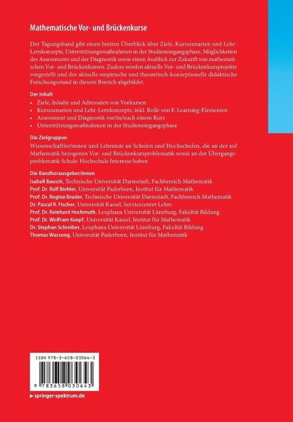 Der Tagungsband gibt einen breiten Überblick über Ziele, Kursszenarien und Lehr-Lernkonzepte, Unterstützungsmaßnahmen in der Studieneingangsphase, Möglichkeiten des Assessments und der Diagnostik sowie einen Ausblick zur Zukunft von mathematischen Vor- und Brückenkursen. Zudem werden aktuelle Vor- und Brückenkursprojekte vorgestellt und der aktuelle empirische und theoretisch-konzeptionelle didaktische Forschungsstand in diesem Bereich abgebildet.