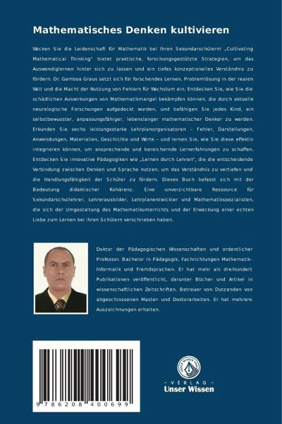 Wecken Sie die Leidenschaft für Mathematik bei Ihren Sekundarschülern! "Cultivating Mathematical Thinking" bietet praktische, forschungsgestützte Strategien, um das Auswendiglernen hinter sich zu lassen und ein tiefes konzeptionelles Verständnis zu fördern. Dr. Gamboa Graus setzt sich für forschendes Lernen, Problemlösung in der realen Welt und die Macht der Nutzung von Fehlern für Wachstum ein. Entdecken Sie, wie Sie die schädlichen Auswirkungen von Mathematikmangel bekämpfen können, die durch aktuelle neurologische Forschungen aufgedeckt wurden, und befähigen Sie jedes Kind, ein selbstbewusster, anpassungsfähiger, lebenslanger mathematischer Denker zu werden. Erkunden Sie sechs leistungsstarke Lehrplanorganisatoren - Fehler, Darstellungen, Anwendungen, Materialien, Geschichte und Werte - und lernen Sie, wie Sie diese effektiv integrieren können, um ansprechende und bereichernde Lernerfahrungen zu schaffen. Entdecken Sie innovative Pädagogiken wie "Lernen durch Lehren", die die entscheidende Verbindung zwischen Denken und Sprache nutzen, um das Verständnis zu vertiefen und die Handlungsfähigkeit der Schüler zu fördern. Dieses Buch befasst sich mit der Bedeutung didaktischer Kohärenz. Eine unverzichtbare Ressource für Sekundarschullehrer, Lehrerausbilder, Lehrplanentwickler und Mathematikspezialisten, die sich der Umgestaltung des Mathematikunterrichts und der Erweckung einer echten Liebe zum Lernen bei ihren Schülern verschrieben haben.
