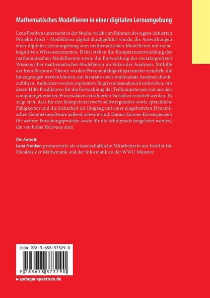Lena Frenken untersucht in der Studie, welche im Rahmen des eigens initiierten Projekts Modi - Modellieren digital durchgeführt wurde, die Auswirkungen einer digitalen Lernumgebung zum mathematischen Modellieren mit metakognitiven Wissenselementen. Dabei stehen die Kompetenzentwicklung des mathematischen Modellierens sowie die Entwicklung des metakognitiven Wissens über mathematisches Modellieren im Fokus der Analysen. Mithilfe der Item Response Theory werden Personenfähigkeitsparameter ermittelt, die hinzugezogen werden können, um bivariate sowie multivariate Analysen durchzuführen. Außerdem werden explorative Regressionsanalysen beschrieben, mit deren Hilfe Prädiktoren für die Entwicklung der Teilkompetenzen mit aus den computergenerierten Prozessdaten extrahierten Variablen ermittelt werden. Es zeigt sich, dass für den Kompetenzerwerb selbstregulative sowie sprachliche Fähigkeiten und die Sicherheit im Umgang mit einer eingebetteten Dynamischen Geometriesoftware äußerst relevant sind. Daraus können Konsequenzen für weitere Forschungsprojekte sowie für die Schulpraxis hergeleitet werden, die von hoher Relevanz sind.