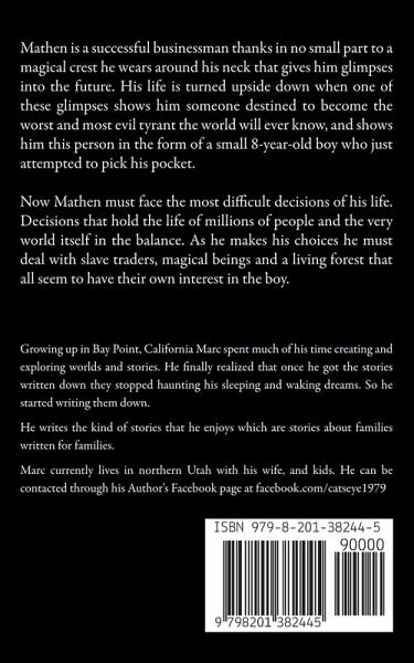 Mathen is a successful businessman thanks in no small part to a magical crest he wears around his neck that gives him glimpses into the future. His life is turned upside down when one of these glimpses shows him someone destined to become the worst and most evil tyrant the world will ever know, and shows him this person in the form of a small 8-year-old boy who just attempted to pick his pocket. Now Mathen must face the most difficult decisions of his life. Decisions that hold the life of millions of people and the very world itself in the balance. As he makes his choices he must deal with slave traders, magical beings and a living forest that all seem to have their own interest in the boy.