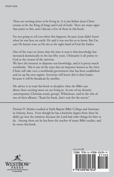 These are exciting times to be living in. It is just before Jesus Christ returns to be the King of kings and Lord of lords. There are many signs that point to this, and I discuss a few of them in this book. I'm not going to tell you when this happens, because Jesus didn't know when he was here on earth. He said it was not for us to know. But I'm sure He knows now, as He sits at the right hand of God the Father. One of the ways we know that the time is near is that knowledge has increased dramatically in the last fifty years. Ultimately it all points to God as the creator of the universe. We have the internet to dispense our knowledge, and it is pretty much worldwide. This is one of the ways that an imposter known as the Anti-Christ will take over a worldwide government that has been established and set up his own regime. Everyone will know this is their leader, because it will be broadcast by satellite. My advice is to read this book to decipher what the Bible says about these exciting times we are living in. As one of my favorite contemporary Christian music groups, Whiteheart, said in the title of one of their albums, "Read the book, don't wait for the movie."