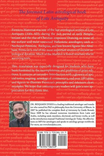 Firmicus Maternus was one of the last astrological writers of Late Antiquity (330s AD), during the rich period of early Neoplatonism and the rise of Christian emperors. Drawing on some of the earliest and most renowned Hellenistic astrologers, such as Necheps¿-Petosiris, Asclepius, and less known figures like Abraham, Firmicus is one of our most important sources of ancient astrological doctrine. Much of the Math¿sis is found nowhere else in surviving texts. This translation was especially designed for students who have been frustrated by the incompleteness and problems of prior editions. It contains an extensive Introduction with a glossary of special terms, ongoing astrological commentary, and over 100 tables and figures to illustrate Firmicus's principles and extensive chart examples. We hope that contemporary readers will gain a new appreciation for this classic text.