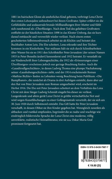 1881 im bairischen Glonn als uneheliches Kind geboren, verbringt Lena Christ ihre ersten Lebensjahre unbeschwert bei ihrem Großvater. Später erfährt sie die Gefühlskälte und andauernde brutale Mißhandlungen ihrer Mutter und fühlt sich zunehmend als "Überflüssige". Nach dem Tod des geliebten Großvaters entflieht sie der häuslichen Situation 1898 in das Kloster Ursberg, das sie kurz darauf enttäuscht und verzweifelt wieder verlässt. Nach einem ersten gescheiterten Selbstmordversuch arbeitet sie als Köchin und heiratet den Buchhalter Anton Leix. Die Ehe scheitert, Lena erkrankt und ihre Töchter kommen in ein Kinderheim. Nur mühsam hält sie sich durch Schreibarbeiten über Wasser bis sie so 1911 den Schriftsteller Peter Jerusalem (der seinen Namen 1933 in Peter Benedix ändert) kennenlernt und 1912 heiratet. Er veranlaßt sie zur Niederschrift ihrer Lebensgeschichte, die 1912 als "Erinnerungen einer Überflüssigen" erscheinen jedoch nur geringe Beachtung finden. Auch die "Lausdirndlgeschichten", in denen Ludwig Thoma eine plumpe Nachahmung seiner "Lausbubengeschichten" sieht, und der 1914 erscheinende Roman "Mathias Bichler" finden zu Lebzeiten wenig Beachtung beim Publikum. "Die Rumplhanni", die zunächst als Drama in drei Aufzügen entsteht, dann aber auf den Rat von Peter Jerusalem zum Roman umgearbeitet wird, erscheint im Herbst 1916. Die Ehe mit Peter Jerusalem scheitert an dem Verhältnis das Lena Christ mit dem Sänger Ludwig Schmidt eingeht bis dieser sie verlässt. Lungenkrank und allein gerät Lena Christ in größte wirtschaftliche Not und wird wegen Kunstfälschungen zu einer Gefängnisstrafe verurteilt, der sie sich am 30. Juni 1920 durch Selbstmord entzieht. Das Gift hatte ihr Peter Jerusalem verschafft, in dessen Obhut sie ihre Kinder gegeben hat. Wenngleich zuweilen als altbacken und rustikal empfunden, begründet die so rauhe und wuchtige wie eindringlich bilderreiche Sprache der Lena Christ eine moderne, völlig unverklärte, realistische Heimatliteratur, wie sie u.a. Oskar Maria Graf prominent fortgesetzt hat.
