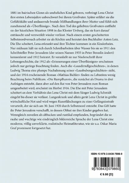 1881 im bairischen Glonn als uneheliches Kind geboren, verbringt Lena Christ ihre ersten Lebensjahre unbeschwert bei ihrem Großvater. Später erfährt sie die Gefühlskälte und andauernde brutale Mißhandlungen ihrer Mutter und fühlt sich zunehmend als "Überflüssige". Nach dem Tod des geliebten Großvaters entflieht sie der häuslichen Situation 1898 in das Kloster Ursberg, das sie kurz darauf enttäuscht und verzweifelt wieder verlässt. Nach einem ersten gescheiterten Selbstmordversuch arbeitet sie als Köchin und heiratet den Buchhalter Anton Leix. Die Ehe scheitert, Lena erkrankt und ihre Töchter kommen in ein Kinderheim. Nur mühsam hält sie sich durch Schreibarbeiten über Wasser bis sie so 1911 den Schriftsteller Peter Jerusalem (der seinen Namen 1933 in Peter Benedix ändert) kennenlernt und 1912 heiratet. Er veranlaßt sie zur Niederschrift ihrer Lebensgeschichte, die 1912 als "Erinnerungen einer Überflüssigen" erscheinen jedoch nur geringe Beachtung finden. Auch die "Lausdirndlgeschichten", in denen Ludwig Thoma eine plumpe Nachahmung seiner "Lausbubengeschichten" sieht, und der 1914 erscheinende Roman "Mathias Bichler" finden zu Lebzeiten wenig Beachtung beim Publikum. "Die Rumplhanni", die zunächst als Drama in drei Aufzügen entsteht, dann aber auf den Rat von Peter Jerusalem zum Roman umgearbeitet wird, erscheint im Herbst 1916. Die Ehe mit Peter Jerusalem scheitert an dem Verhältnis das Lena Christ mit dem Sänger Ludwig Schmidt eingeht bis dieser sie verlässt. Lungenkrank und allein gerät Lena Christ in größte wirtschaftliche Not und wird wegen Kunstfälschungen zu einer Gefängnisstrafe verurteilt, der sie sich am 30. Juni 1920 durch Selbstmord entzieht. Das Gift hatte ihr Peter Jerusalem verschafft, in dessen Obhut sie ihre Kinder gegeben hat. Wenngleich zuweilen als altbacken und rustikal empfunden, begründet die so rauhe und wuchtige wie eindringlich bilderreiche Sprache der Lena Christ eine moderne, völlig unverklärte, realistische Heimatliteratur, wie sie u.a. Oskar Maria Graf prominent fortgesetzt hat.
