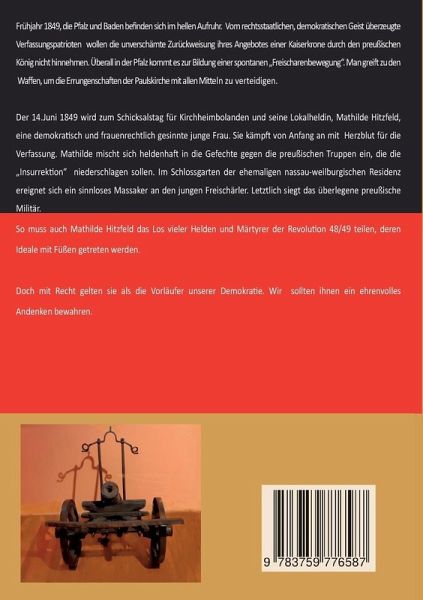 Frühjahr 1849, die Pfalz und Baden befinden sich im hellen Aufruhr. Vom rechtsstaatlichen, demokratischen Geist überzeugte Verfassungspatrioten wollen die unverschämte Zurückweisung ihres Angebotes einer Kaiserkrone durch den preußischen König nicht hinnehmen. Überall in der Pfalz kommt es zur Bildung einer spontanen Freischaren Bewegung. Man greift zu den Waffen, um die Errungenschaften der Paulskirche mit allen Mitteln zu verteidigen. In Baden geht sogar das Militär zum Volk über, und der König muss flüchten. Der 14.Juni 1849 wird zum Schicksalstag für Kirchheimbolanden und seine Lokalheldin, Mathilde Hitzfeld, eine demokratisch und frauenrechtlich gesinnte junge Frau. Sie kämpft von Anfang an mit Herzblut für die Verfassung. Mathilde mischt sich heldenhaft in die Gefechte gegen die preußischen Truppen ein, die die Insurrektion niederschlagen sollen. Im Schlossgarten der ehemaligen nassau-weilburgischen Residenz ereignet sich ein sinnloses Massaker an den jungen Freischärler. Letztlich siegt das überlegene preußische Militär. So muss auch Mathilde Hitzfeld das Los vieler Helden und Märtyrer der Revolution 48/49 teilen, deren Ideale mit Füßen getreten werden. Doch mit Recht gelten sie als die Vorläufer unserer Demokratie. Wir sollten ihnen ein ehrenvolles Andenken bewahren.
