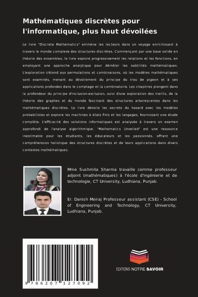 Le livre "Discrete Mathematics" emmène les lecteurs dans un voyage enrichissant à travers le monde complexe des structures discrètes. Commençant par une base solide en théorie des ensembles, le livre explore progressivement les relations et les fonctions, en employant une approche analytique pour démêler les subtilités mathématiques. L'exploration s'étend aux permutations et combinaisons, où les modèles mathématiques sont examinés, menant au dévoilement du principe du trou de pigeon et à ses applications profondes dans le comptage et la combinatoire. Les chapitres plongent dans la profondeur du principe d'inclusion-exclusion, suivi d'une exploration des treillis, de la théorie des graphes et du monde fascinant des structures arborescentes dans les mathématiques discrètes. Le livre dévoile les secrets du hasard avec les modèles probabilistes et explore les machines à états finis et les langages, fournissant une étude complète. L'efficacité des solutions informatiques est analysée à travers un examen approfondi de l'analyse algorithmique. "Mathematics Unveiled" est une ressource inestimable pour les étudiants, les éducateurs et les passionnés, offrant une compréhension holistique des structures discrètes et de leurs applications dans divers contextes mathématiques.