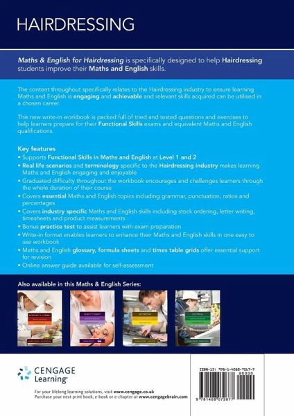 Helps learners to improve their Maths and English skills and prepare for Level 1 and Level 2 Functional Skills exams. In this title, the format enables learners to practice and improve their maths and English skills and real-life questions, exercises and scenarios are written with a Hairdressing context.