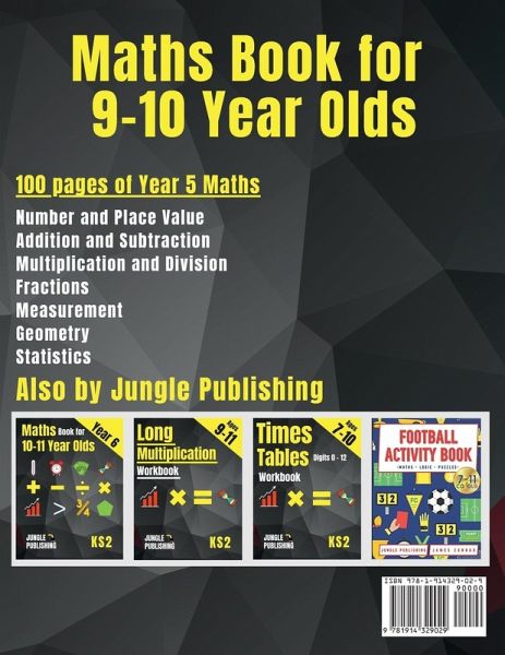 Year 5 Maths Workbook for ages 9-10. A Maths Workbook covering the National Curriculum for Y5/KS2/P6Number and Place Value Addition and Subtraction: Mental Arithmetic Long Multiplication and Division Remainders. Fractions: Multiplying, Dividing and Simplifying. Measurement: Telling the time, volume, surface area. Geometry: Polygons, using a protractor, word problems. Statistics: Line Graphs and Time Tables Perfect for home learning and SATs preparation