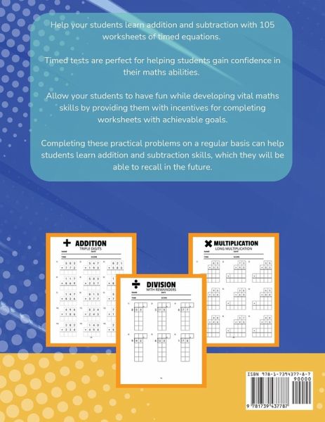 Want to boost your child's learning without using a screen? Then this addition and subtraction maths workbook is the perfect way. 105 Timed Maths Worksheets - A variety of Addition, Subtraction, Multiplication, and Division based questions aimed at kids in Grade 2. Questions include single, double, and triple digits, missing numbers, triple rows, and remainders. Solutions to questions are also included in the back of the book. Encourage Skill Building - Helps kids gain confidence with their arithmetic skills which can help with their current and future education. Each section starts off with the easier questions and progressively gets harder. Keep Track of Progression - Each worksheet has score input. This will allow the child to aim to better themselves, and to achieve a perfect score each time. Perfect to Give as a Gift - Treat any child with this maths workbook, whether it be for Christmas, Easter, Birthdays, Summer or any other holidays, Halloween, Road / Travel Trips, and any other occasion.