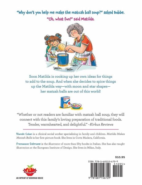 Matilda has always loved watching Bubbe make the soup. Now she wants to try out some of her own ideas. Adding lemon and dill to the matzah balls seems like a great idea. But making one GIANT matzah ball is a giant mistake. Yet Bubbe is encouraging. "The best part of experimenting is you can always try again," she tells Matilda. And so the grandmother/granddaughter cooking team continues the kitchen experiments, with some unusual (and unusually delicious!) results. Includes a recipe for Matilda and Bubbe's Matzah Ball Soup.