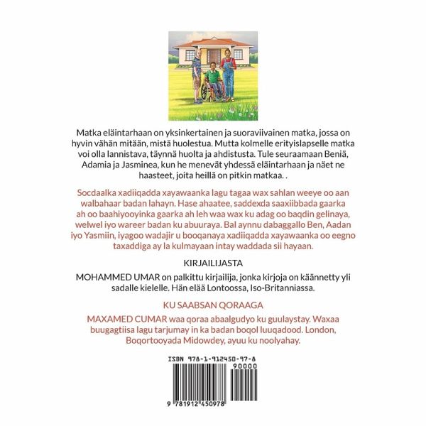 Matka eläintarhaan on yksinkertainen ja suoraviivainen matka, jossa on hyvin vähän mitään, mistä huolestua. Mutta kolmelle erityislapselle matka voi olla lannistava, täynnä huolta ja ahdistusta. Tule seuraamaan Beniä, Adamia ja Jasminea, kun he menevät yhdessä eläintarhaan ja näet ne haasteet, joita heillä on pitkin matkaa. Socdaalka xadiiqadda xayawaanka lagu tagaa wax sahlan weeye oo aan walbahaar badan lahayn. Hase ahaatee, saddexda saaxiibbada gaarka ah oo baahiyooyinka gaarka ah leh waa wax ku adag oo baqdin gelinaya, welwel iyo wareer badan ku abuuraya. Bal aynnu dabaggallo Ben, Aadan iyo Yasmiin, iyagoo wadajir u booqanaya xadiiqadda xayawaanka oo eegno taxaddiga ay la kulmayaan intay waddada sii hayaan. A bilingual edition of this book is available in the following languages: Afar, Afrikaans, Amharic, Finnish, Kinyarwanda, Kirundi, Luganda, Malagasy, Ndebele, Oromo, Sesotho, Setswana, Somali, Somali Osmanya, Shona, Swahili, Swedish, Tigrinya, Xhosa and Zulu.