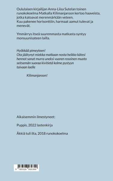 Anna-Liisa Sutelan toinen runokokoelma Matkalla Kilimanjaroon kertoo haaveista, jotka katoavat merenmärkään veteen. Kuu pakenee horisonttiin, harmaat aamut tulevat ja menevät. Ymmärrys itseä suuremmasta matkasta syntyy monsuunisateen lailla. "Minä olen väkevä yö, minä huojun tuulessa ja menen".