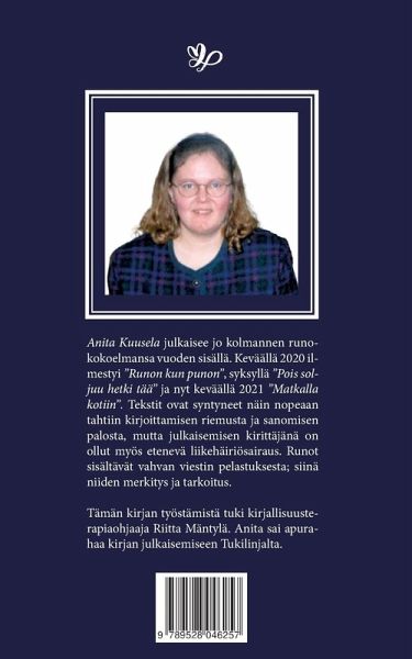 Matkalla kotiin on Anita Kuuselan kolmas runokirja. Tekstit ovat syntyneet näin nopeaan tahtiin kirjoittamisen riemusta ja sanomisen palosta, mutta julkaisemisen kirittäjänä on ollut myös etenevä liikehäiriösairaus. Runot sisältävät vahvan viestin pelastuksesta; siinä niiden merkitys ja tarkoitus.