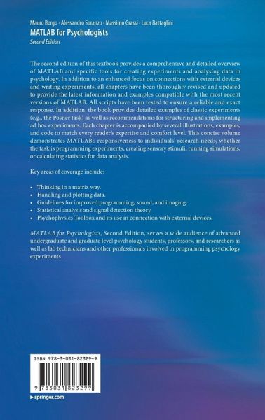 The second edition of this textbook provides a comprehensive and detailed overview of MATLAB and specific tools for creating experiments and analysing data in psychology. In addition to an enhanced focus on connections with external devices and writing experiments, all chapters have been thoroughly revised and updated to provide the latest information and examples compatible with the most recent versions of MATLAB. All scripts have been tested to ensure a reliable and exact response. In addition, the book provides detailed examples of classic experiments (e.g., the Posner task) as well as recommendations for structuring and implementing ad hoc experiments. Each chapter is accompanied by several illustrations, examples, and code to match every reader's expertise and comfort level. This concise volume demonstrates MATLAB's responsiveness to individuals' research needs, whether the task is programming experiments, creating sensory stimuli, running simulations, or calculating statistics for data analysis.