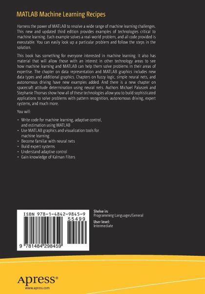 Harness the power of MATLAB to resolve a wide range of machine learning challenges. This new and updated third edition provides examples of technologies critical to machine learning. Each example solves a real-world problem, and all code provided is executable. You can easily look up a particular problem and follow the steps in the solution. This book has something for everyone interested in machine learning. It also has material that will allow those with an interest in other technology areas to see how machine learning and MATLAB can help them solve problems in their areas of expertise. The chapter on data representation and MATLAB graphics includes new data types and additional graphics. Chapters on fuzzy logic, simple neural nets, and autonomous driving have new examples added. And there is a new chapter on spacecraft attitude determination using neural nets. Authors Michael Paluszek and Stephanie Thomas show how all of these technologies allow you to build sophisticated applications to solve problems with pattern recognition, autonomous driving, expert systems, and much more. What You Will LearnWrite code for machine learning, adaptive control, and estimation using MATLABUse MATLAB graphics and visualization tools for machine learningBecome familiar with neural netsBuild expert systemsUnderstand adaptive controlGain knowledge of Kalman Filters Who This Book Is For Software engineers, control engineers, university faculty, undergraduate and graduate students, hobbyists.
