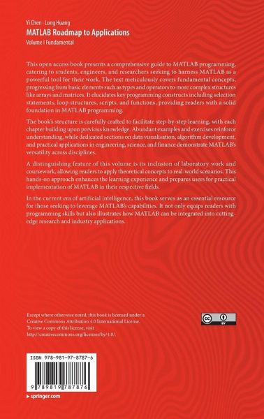 This open access book presents a comprehensive guide to MATLAB programming, catering to students, engineers, and researchers seeking to harness MATLAB as a powerful tool for their work. The text meticulously covers fundamental concepts, progressing from basic elements such as types and operators to more complex structures like arrays and matrices. It elucidates key programming constructs including selection statements, loop structures, scripts, and functions, providing readers with a solid foundation in MATLAB programming. The book's structure is carefully crafted to facilitate step-by-step…mehr