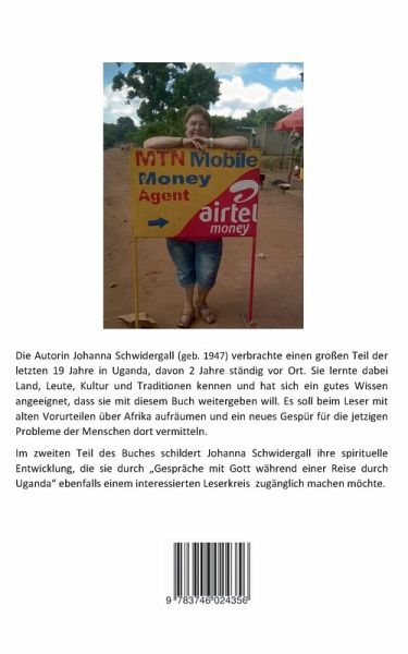 Uganda Seit dem Jahr 2000 engagiert sich die Autorin auf privater Basis in Uganda, dem Land am Äquator.Unzählige Reisen und einen zweijährigen Daueraufenthalt dort nutzte Johanna Maria Schwidergall, um sich mit der Tradition, der Kultur und der politisch-gesellschaftlichen Lage des Landes eingehend zu befassen. Aus dem Reichtum ihrer eigenen Erfahrungen durch das Leben direkt bei und mit den dortigen Menschen entstand das vorliegende Buch. Es soll die Leser mitnehmen in die Vielfältigkeit, Fröhlichkeit, Andersartigkeit und auch Armut dieses Teils von Afrika. Und es soll Sehnsucht wecken nach einer anderen Art von Leben.