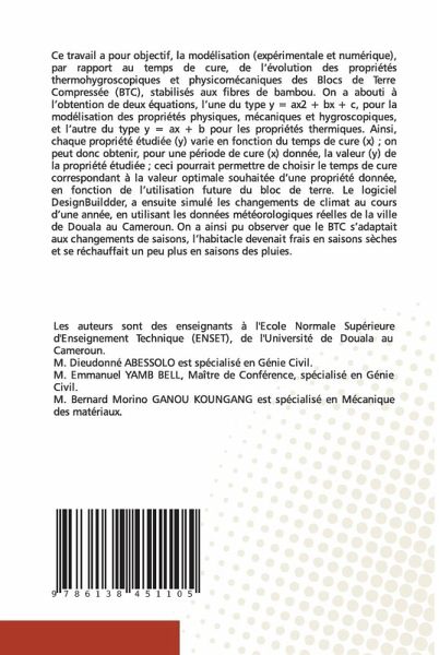 Ce travail a pour objectif, la modélisation (expérimentale et numérique), par rapport au temps de cure, de l'évolution des propriétés thermohygroscopiques et physicomécaniques des Blocs de Terre Compressée (BTC), stabilisés aux fibres de bambou. On a abouti à l'obtention de deux équations, l'une du type y = ax2 + bx + c, pour la modélisation des propriétés physiques, mécaniques et hygroscopiques, et l'autre du type y = ax + b pour les propriétés thermiques. Ainsi, chaque propriété étudiée (y) varie en fonction du temps de cure (x) ; on peut donc obtenir, pour une période de cure (x) donnée, la valeur (y) de la propriété étudiée ; ceci pourrait permettre de choisir le temps de cure correspondant à la valeur optimale souhaitée d'une propriété donnée, en fonction de l'utilisation future du bloc de terre. Le logiciel DesignBuildder, a ensuite simulé les changements de climat au cours d'une année, en utilisant les données météorologiques réelles de la ville de Douala au Cameroun. On a ainsi pu observer que le BTC s'adaptait aux changements de saisons, l'habitacle devenait frais en saisons sèches et se réchauffait un peu plus en saisons des pluies.