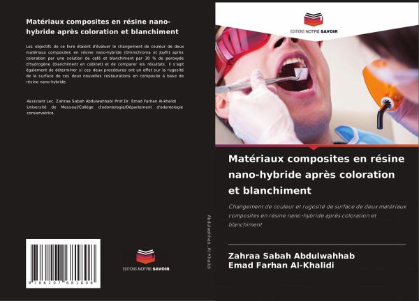 Les objectifs de ce livre étaient d'évaluer le changement de couleur de deux matériaux composites en résine nano-hybride (Omnichroma et Joyfil) après coloration par une solution de café et blanchiment par 30 % de peroxyde d'hydrogène (blanchiment en cabinet) et de comparer les résultats. Il s'agit également de déterminer si ces deux procédures ont un effet sur la rugosité de la surface de ces deux nouvelles restaurations en composite à base de résine nano-hybride.