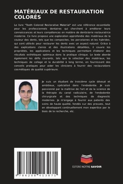 Le livre "Tooth Colored Restorative Material" est une référence essentielle pour les professionnels dentaires qui cherchent à améliorer leurs connaissances et leurs compétences en matière de dentisterie restauratrice moderne. Ce livre propose une exploration approfondie des matériaux de la couleur des dents, tels que les composites, les porcelaines et les hybrides, qui sont utilisés pour restaurer les dents avec un aspect naturel. Grâce à des explications claires et des illustrations détaillées, il couvre les propriétés, les applications et les techniques permettant d'obtenir des résultats esthétiques optimaux dans la pratique clinique. Le texte aborde également les défis courants, tels que la sélection des matériaux, les techniques de collage et la durabilité à long terme, en fournissant des conseils pratiques pour aider les cliniciens à fournir des restaurations cosmétiques de qualité supérieure.
