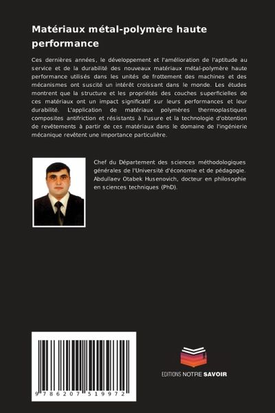 Ces dernières années, le développement et l'amélioration de l'aptitude au service et de la durabilité des nouveaux matériaux métal-polymère haute performance utilisés dans les unités de frottement des machines et des mécanismes ont suscité un intérêt croissant dans le monde. Les études montrent que la structure et les propriétés des couches superficielles de ces matériaux ont un impact significatif sur leurs performances et leur durabilité. L'application de matériaux polymères thermoplastiques composites antifriction et résistants à l'usure et la technologie d'obtention de revêtements à partir de ces matériaux dans le domaine de l'ingénierie mécanique revêtent une importance particulière.
