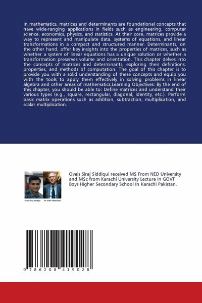 In mathematics, matrices and determinants are foundational concepts that have wide-ranging applications in fields such as engineering, computer science, economics, physics, and statistics. At their core, matrices provide a way to represent and manipulate data, systems of equations, and linear transformations in a compact and structured manner. Determinants, on the other hand, offer key insights into the properties of matrices, such as whether a system of linear equations has a unique solution or whether a transformation preserves volume and orientation. This chapter delves into the concepts of matrices and determinants, exploring their definitions, properties, and methods of computation. The goal of this chapter is to provide you with a solid understanding of these concepts and equip you with the tools to apply them effectively in solving problems in linear algebra and other areas of mathematics.Learning Objectives: By the end of this chapter, you should be able to: Define matrices and understand their various types (e.g., square, rectangular, diagonal, identity, etc.). Perform basic matrix operations such as addition, subtraction, multiplication, and scalar multiplication.