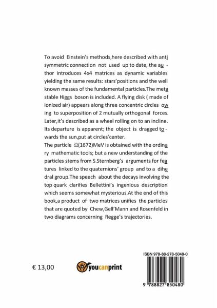 Per evitare i metodi di Einstein, benché siano descritti, l'autore introduce matrici 4x4 per ottenere gli stessi risultati, cioè per trovare posizioni di stelle ed anche i ben noti valori delle particelle fondamentali, includendo il bosone di Higgs. Un disco volante (fatto di aria ionizzata) appare lungo tre cerchi concentrici a causa di due forze oscillanti mutuamente ortogonali. Successivamente può essere immaginato come una ruota che rotola su un piano inclinato. Questo oggetto si è formato a circa 3000m di altezza. L'allontanamento è apparente: l'oggetto sta precipitando dalla parte del sole. La particella ¿(1672)MeV viene trovata con gli strumenti matematici adeguati; ma una nuova comprensione delle particelle si ha sviluppando argomentazioni di S. Sternberg, che predicono caratteristiche dipendenti dal gruppo dei quaternioni e da un gruppo diedrale. I decadimenti comprendenti il top quark, mostrati in questo libro, forniscono una spiegazione chiara e completa della descrizione data da Bellettini che sembra alquanto misteriosa. Alla fine del libro, il prodotto di due matrici unifica le particelle indicate da Chew, Gell'Mann e Rosenfeld lungo traiettorie di Regge.