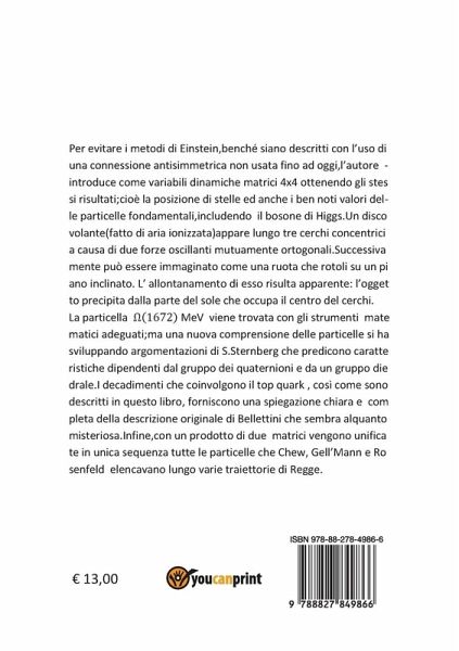 Per evitare i metodi di Einstein, benché siano descritti, l'autore introduce matrici 4x4 per ottenere gli stessi risultati, cioè per trovare posizioni di stelle ed anche i ben noti valori delle particelle fondamentali, includendo il bosone di Higgs. Un disco volante (fatto di aria ionizzata) appare lungo tre cerchi concentrici a causa di due forze oscillanti mutuamente ortogonali. Successivamente può essere immaginato come una ruota che rotola su un piano inclinato. Questo oggetto si è formato a circa 3000m di altezza. L'allontanamento è apparente: l'oggetto sta precipitando dalla parte del sole. La particella ¿(1672)MeV viene trovata con gli strumenti matematici adeguati; ma una nuova comprensione delle particelle si ha sviluppando argomentazioni di S. Sternberg, che predicono caratteristiche dipendenti dal gruppo dei quaternioni e da un gruppo diedrale. I decadimenti comprendenti il top quark, mostrati in questo libro, forniscono una spiegazione chiara e completa della descrizione data da Bellettini che sembra alquanto misteriosa. Alla fine del libro, il prodotto di due matrici unifica le particelle indicate da Chew, Gell'Mann e Rosenfeld lungo traiettorie di Regge.