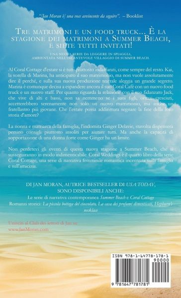 Tre matrimoni e un food truck... È la stagione dei matrimoni a Summer Beach, e siete tutti invitati!Da una serie bestseller di USA Today. Al Coral Cottage d'estate si è tutti piuttosto indaffarati, come sempre del resto. Kai, la sorella di Marina, ha anticipato il suo matrimonio, ma non vuole assolutamente dire il perché, e sulla sua nuova produzione teatrale aleggia un grande segreto. Marina è comunque decisa a espandere ancora il suo Coral Cafè con un nuovo food truck e un nuovo staff. Per quanto riguarda la relazione con il suo fidanzato Jack, che vive di alti e bassi, non sa nemmeno se i suoi figli, ormai cresciuti, accetterebbero serenamente non solo un nuovo matrimonio, ma anche un fratellastro più giovane. Che l'estate possa addirittura segnare la fine della loro storia d'amore? La nonna e matriarca della famiglia, l'indomita Ginger Delavie, stavolta dispenserà persino consigli piuttosto insoliti per aiutare tutti. Ma anche la capacità di sopportazione di una donna forte come Ginger ha un limite. Non perdetevi gli eventi di questa nuova stagione a Summer Beach, che si susseguiranno in modo indimenticabile. Coral Weddings è il quarto libro della serie Coral Cottage, una serie di narrativa femminile romantica incentrata sulla famiglia e sull'amicizia.