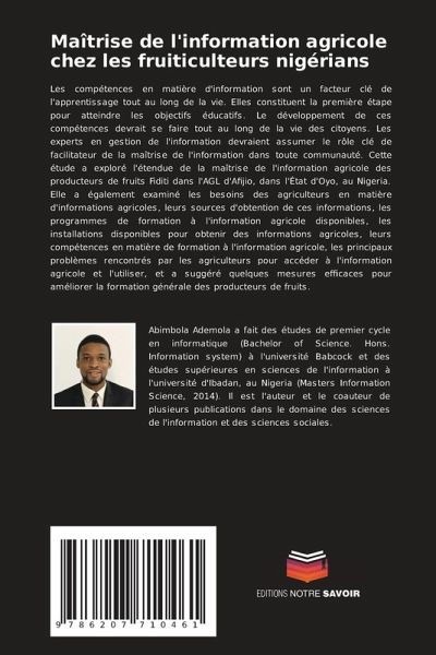 Les compétences en matière d'information sont un facteur clé de l'apprentissage tout au long de la vie. Elles constituent la première étape pour atteindre les objectifs éducatifs. Le développement de ces compétences devrait se faire tout au long de la vie des citoyens. Les experts en gestion de l'information devraient assumer le rôle clé de facilitateur de la maîtrise de l'information dans toute communauté. Cette étude a exploré l'étendue de la maîtrise de l'information agricole des producteurs de fruits Fiditi dans l'AGL d'Afijio, dans l'État d'Oyo, au Nigeria. Elle a également examiné les besoins des agriculteurs en matière d'informations agricoles, leurs sources d'obtention de ces informations, les programmes de formation à l'information agricole disponibles, les installations disponibles pour obtenir des informations agricoles, leurs compétences en matière de formation à l'information agricole, les principaux problèmes rencontrés par les agriculteurs pour accéder à l'information agricole et l'utiliser, et a suggéré quelques mesures efficaces pour améliorer la formation générale des producteurs de fruits.