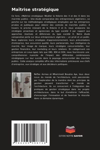 Ce livre, «Maîtrise stratégique: Révéler la théorie des X et des O dans les marchés publics - Une étude comparative des entrepreneurs algériens», se penche sur les méthodologies stratégiques employées par les entreprises privées et publiques pour obtenir des contrats de marchés publics. À travers le prisme innovant de la théorie X et O, nous analysons les stratégies proactives et agressives du type société X par rapport aux approches réactives et défensives du type société O. Notre étude comparative porte sur deux entrepreneurs algériens - un privé et un public. Nous explorons leurs stratégies d'approvisionnement, leurs présentations d'entreprise, leur assurance qualité, leurs partenariats, leur intelligence du marché, leur image de marque, leurs stratégies concurrentielles, leur gestion financière, leur marketing et leurs relations. En catégorisant ces entreprises en sous-types tels que XXO, XOX et OOX, nous fournissons une compréhension nuancée de l'impact des différentes combinaisons stratégiques sur leur succès dans le paysage concurrentiel des marchés publics. Cette analyse complète offre des informations précieuses aux chefs d'entreprise, aux stratèges et aux décideurs politiques.