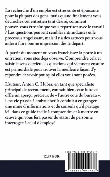 La recherche d'un emploi est stressante et épuisante pour la plupart des gens, mais quand finalement vous décrochez cet entretien tant désiré, comment pouvez-vous être sûr que vous repartirez avec le travail ? Les questions peuvent sembler intimidantes et le processus angoissant, mais il y a des astuces pour vous aider à faire bonne impression dès le départ.À partir du moment où vous franchissez la porte à un entretien, vous êtes déjà observé. Comprendre cela et saisir le sens derrière les questions qui viennent ensuite est primordiale pour trouver la meilleure façon d'y répondre et savoir pourquoi elles vous sont posées.L'auteur, Anton C. Huber, en tant que spécialiste principal de recrutement, connaît bien cette lutte et offre un aperçu précieux de « l'autre côté du bureau ». Une vie passée à embaucher l'a conduit à engranger une mine d'informations et de conseils qu'il partage ici, dans ce guide facile à comprendre et à mettre en oeuvre qui vous fera passer du statut de personne interrogée à celui d'employé.