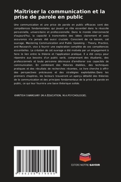 Une communication et une prise de parole en public efficaces sont des compétences fondamentales qui jouent un rôle essentiel dans la réussite personnelle, universitaire et professionnelle. Dans le monde interconnecté d'aujourd'hui, la capacité à transmettre des idées clairement et avec assurance n'a jamais été aussi cruciale. Conscient de ce besoin, cet ouvrage, Mastering Communication and Public Speaking : Theory, Practice, and Research, vise à fournir une exploration complète de ces compétences essentielles. La création de cet ouvrage a été motivée par un engagement à faire le lien entre la théorie et l'application pratique. Il a été conçu pour répondre aux besoins d'un public varié, comprenant des étudiants, des professionnels et toute personne désireuse d'améliorer ses capacités de communication. En combinant des théories établies, des techniques pratiques et des résultats de recherches récentes, ce livre cherche à offrir des perspectives précieuses et des stratégies exploitables.Dans les premiers chapitres, les lecteurs trouveront un aperçu détaillé des théories de la communication et des principes fondamentaux de la prise de parole en public, ce qui leur fournira une base théorique solide.
