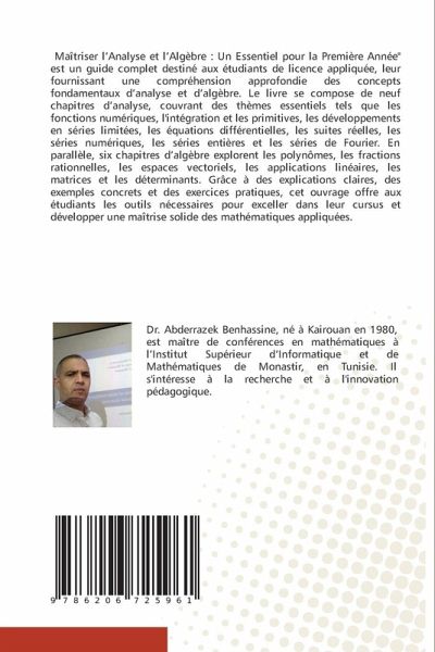 Maîtriser l'Analyse et l'Algèbre : Un Essentiel pour la Première Année" est un guide complet destiné aux étudiants de licence appliquée, leur fournissant une compréhension approfondie des concepts fondamentaux d'analyse et d'algèbre. Le livre se compose de neuf chapitres d'analyse, couvrant des thèmes essentiels tels que les fonctions numériques, l'intégration et les primitives, les développements en séries limitées, les équations différentielles, les suites réelles, les séries numériques, les séries entières et les séries de Fourier. En parallèle, six chapitres d'algèbre explorent les polynômes, les fractions rationnelles, les espaces vectoriels, les applications linéaires, les matrices et les déterminants. Grâce à des explications claires, des exemples concrets et des exercices pratiques, cet ouvrage offre aux étudiants les outils nécessaires pour exceller dans leur cursus et développer une maîtrise solide des mathématiques appliquées.