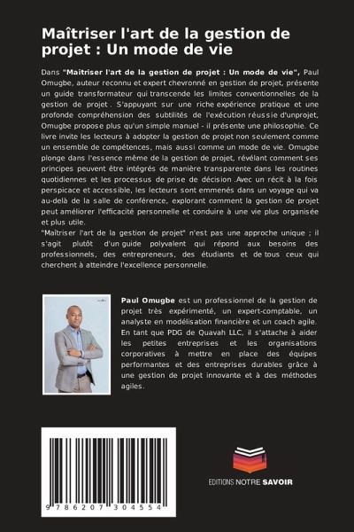 Dans "Maîtriser l'art de la gestion de projet : Un mode de vie", Paul Omugbe, auteur reconnu et expert chevronné en gestion de projet, présente un guide transformateur qui transcende les limites conventionnelles de la gestion de projet . S'appuyant sur une riche expérience pratique et une profonde compréhension des subtilités de l'exécution réussie d'unprojet, Omugbe propose plus qu'un simple manuel - il présente une philosophie. Ce livre invite les lecteurs à adopter la gestion de projet non seulement comme un ensemble de compétences, mais aussi comme un mode de vie. Omugbe plonge dans l'essence même de la gestion de projet, révélant comment ses principes peuvent être intégrés de manière transparente dans les routines quotidiennes et les processus de prise de décision .Avec un récit à la fois perspicace et accessible, les lecteurs sont emmenés dans un voyage qui va au-delà de la salle de conférence, explorant comment la gestion de projet peut améliorer l'efficacité personnelle et conduire à une vie plus organisée et plus utile."Maîtriser l'art de la gestion de projet" n'est pas une approche unique ; il s'agit plutôt d'un guide polyvalent qui répond aux besoins des professionnels, des entrepreneurs, des étudiants et de tous ceux qui cherchent à atteindre l'excellence personnelle.