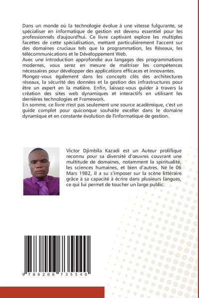Dans un monde où la technologie évolue à une vitesse fulgurante, se spécialiser en informatique de gestion est devenu essentiel pour les professionnels d'aujourd'hui. Ce livre captivant explore les multiples facettes de cette spécialisation, mettant particulièrement l'accent sur des domaines cruciaux tels que la programmation, les Réseaux, les télécommunications et le Développement Web.Avec une introduction approfondie aux langages des programmations modernes, vous serez en mesure de maîtriser les compétences nécessaires pour développer des applications efficaces et innovantes.Plongez-vous également dans les concepts clés des architectures réseaux, la sécurité des données et la gestion des infrastructures pour être un expert en la matière. Enfin, laissez-vous guider à travers la création des sites web dynamiques et interactifs en utilisant les dernières technologies et Framework.En somme, ce livre n'est pas seulement une source académique, c'est un guide complet pour quiconque souhaite exceller dans le domaine dynamique et en constante évolution de l'informatique de gestion.